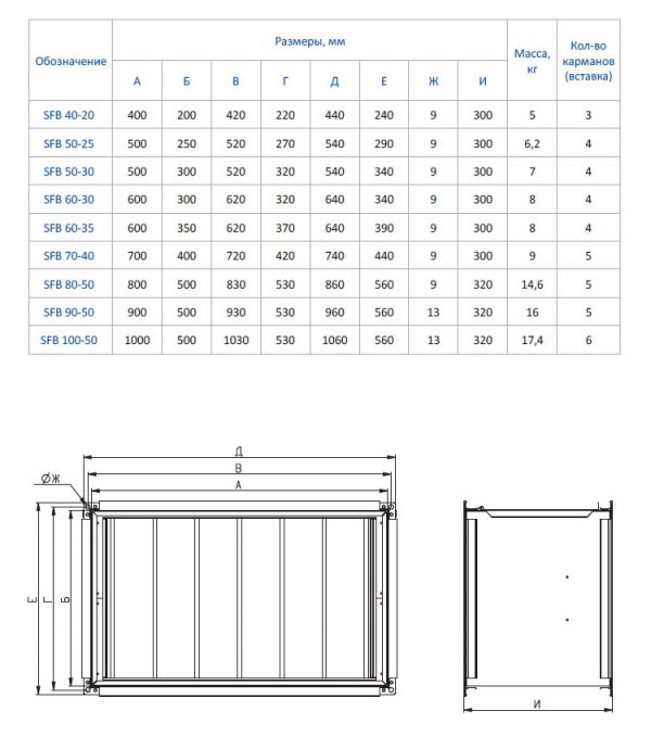 В стандартном исполнении корпус фильтра SFB изготовлен из оцинкованного стального листа. Сменные фильтрующие вставки изготавливаются из фильтрующих материалов классов очистки G4 (EU3), а при специальном заказе из материала класса очистки F5 (EU5).